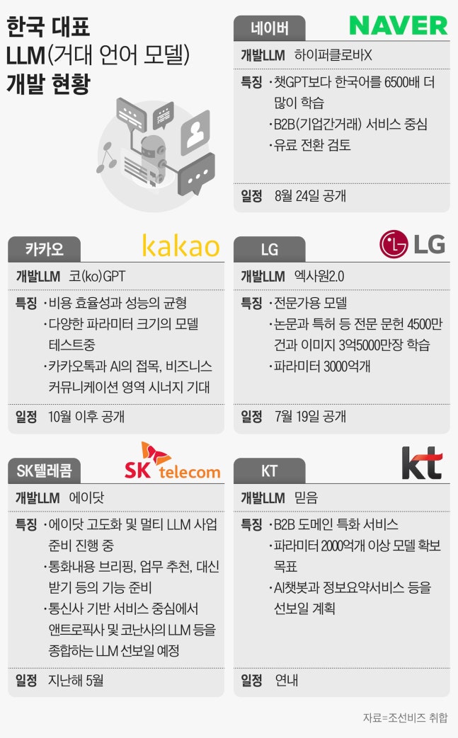 오픈AI가 지난해 11월 챗GPT를 처음 선보인 이후 빅테크간 생성형 AI 패권 전쟁이 벌어지고 있다. 미국에서는 MS 외에 구글·메타·테슬라·애플·엔비디아·아마존이, 중국에서는 바이두·알리바바가 초거대 AI 개발에 뛰어들었다. 한국형 AI 대전도 치열하다. 국내에서는 네이버가 하이퍼클로바X를 공개한 데 이어 카카오도 연내 ‘코(ko)GPT 2.0′을 선보일 계획이다, KT(믿음)·SK텔레콤(에이닷)·LG(엑사원)·엔씨소프트(바르코)도 앞다퉈 LLM을 선보이며 시장 선점에 나섰다. LLM은 AI가 사전 학습한 데이터로 새로운 결과물을 만들어 내는 생성형 AI의 기반 기술이다.
